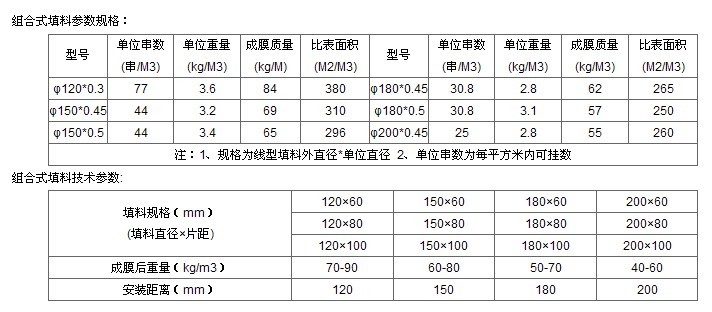 組合填料參數規格:單元直徑Φ150mm,間距有80mm、100mm兩種規格。中心繩有塑料繩及纖維繩兩種。組合填料訂貨須知: 訂貨請明確所需組合填料的長度、立方數、間距、參數規格等